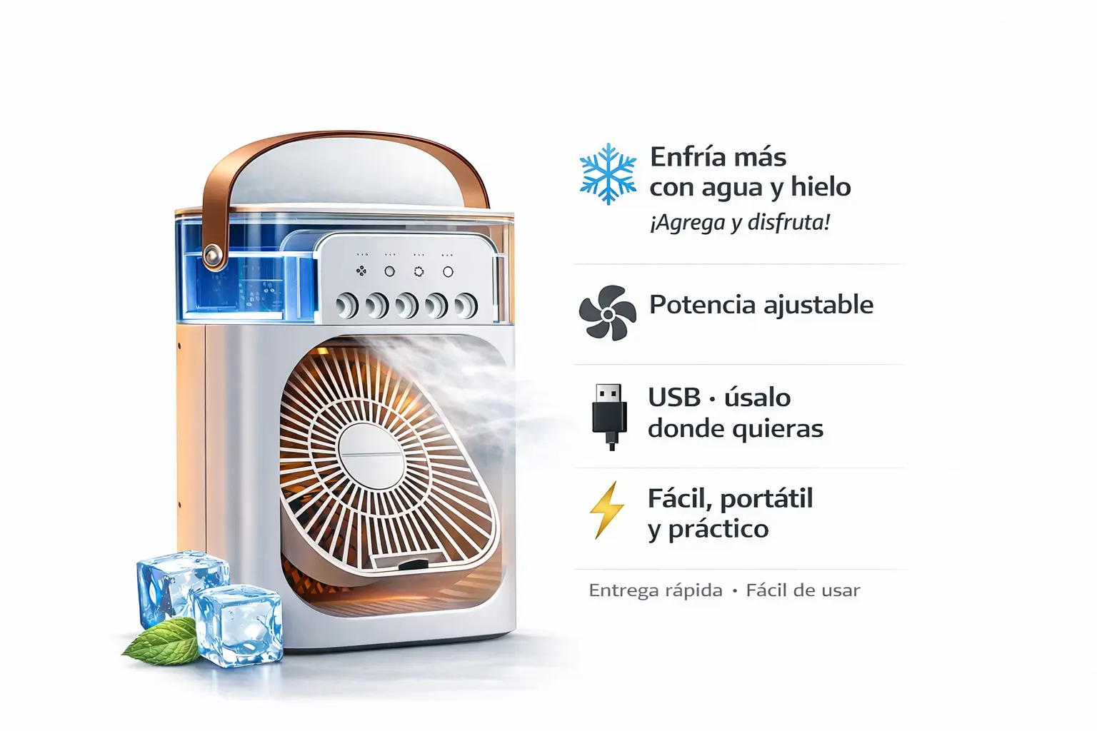Solo agrega agua o hielo, conéctalo por USB y disfruta un ambiente más fresco al instante.